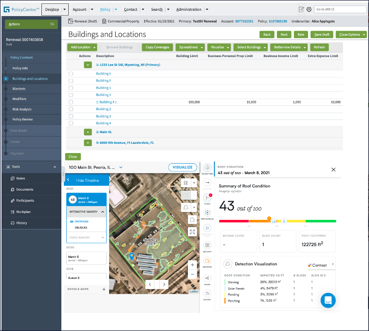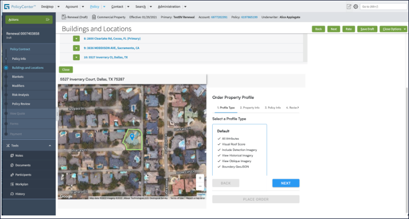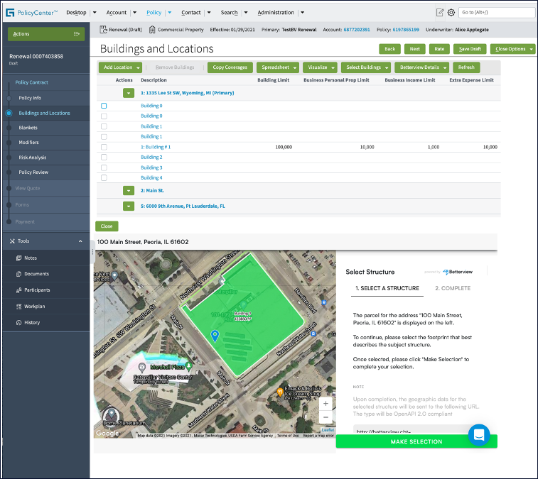 There are instances where a policy only covers a selection of buildings at a particular address. The Betterview Footprint Selection page allows a user to identify building footprints within a parcel and select which ones are insured. On selection, the individual buildings are added into the policy, where a user can set unique coverages for each.