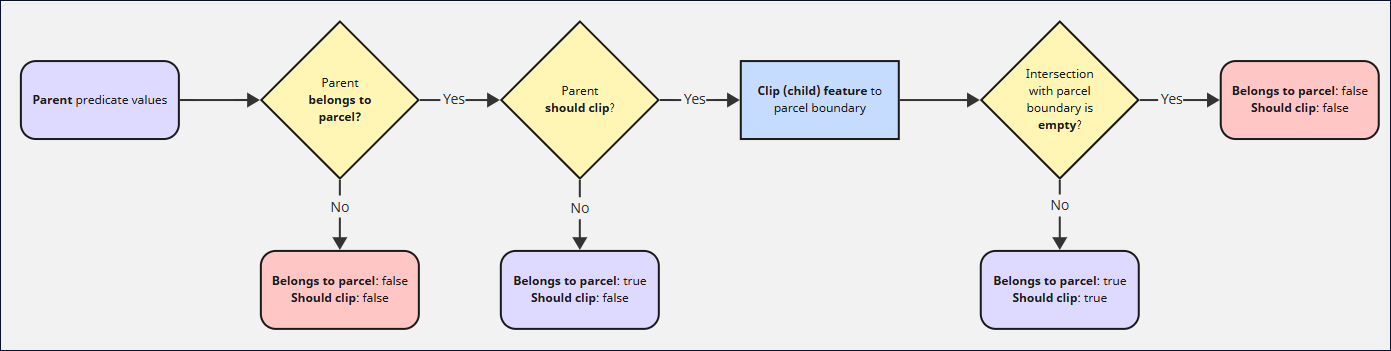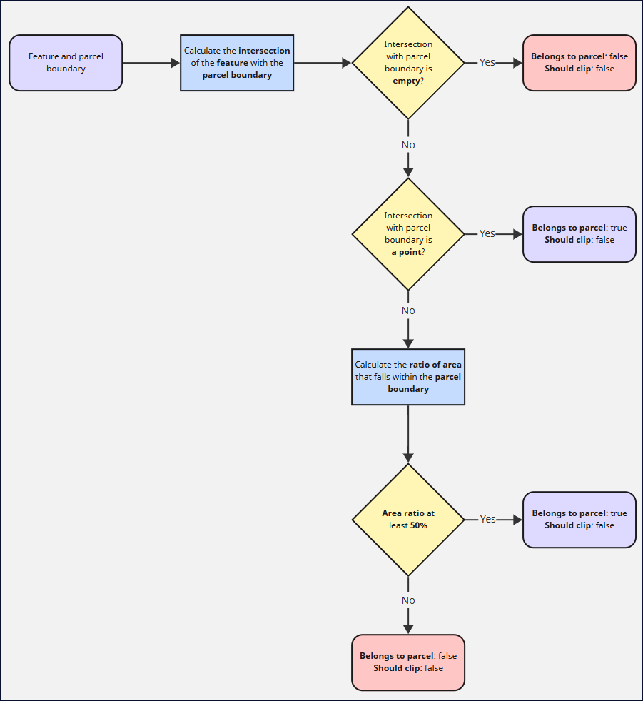 If the feature has no parent predicates and is not connected, the spatial relationship of the feature and parcel will be assessed to make a determination of whether it belongs to the parcel, and whether it should be clipped. There are two key paths: