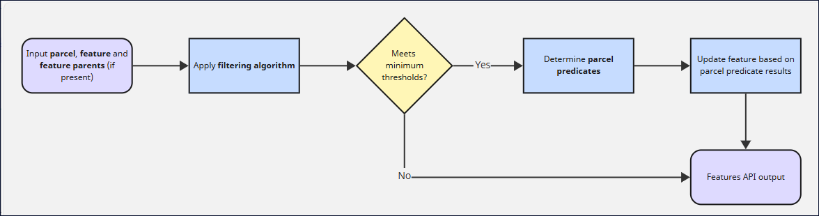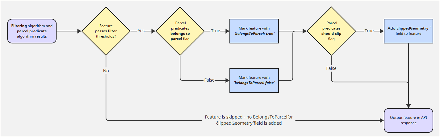 If not excluded by the filtering algorithm, the results of the parcel predicates algorithm will be used to update the feature in the Features API response.