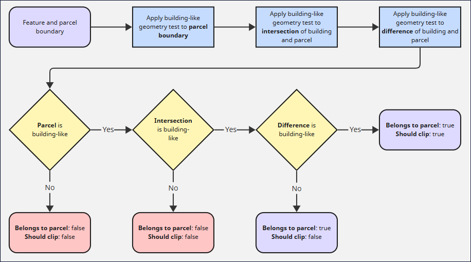 belongsToParcel: whereparcelIsBuildinglikeandintersectionIsBuildinglikeare both true.shouldClip: whereparcelIsBuildinglike,intersectionIsBuildinglikeanddifferenceIsBuildinglikeare all true.